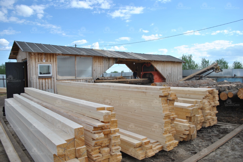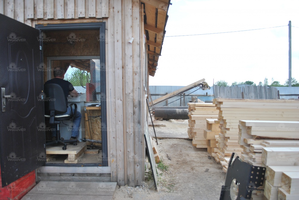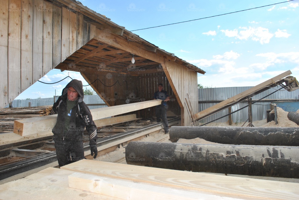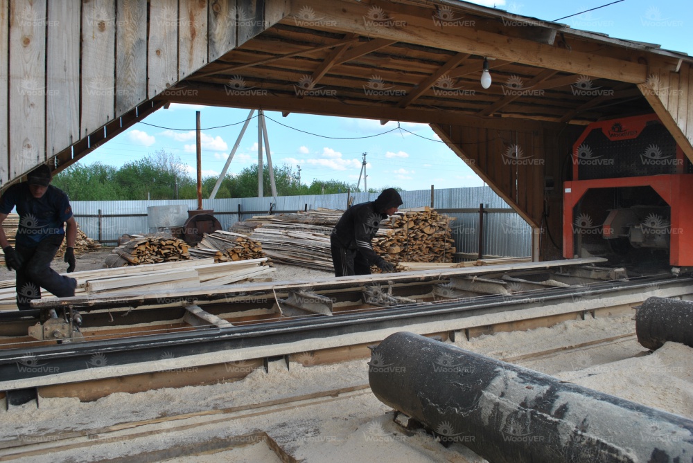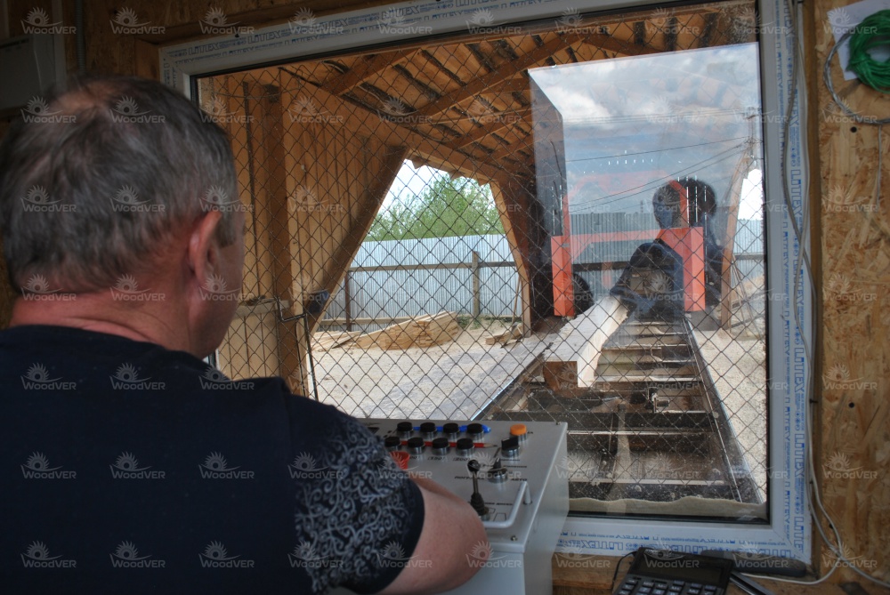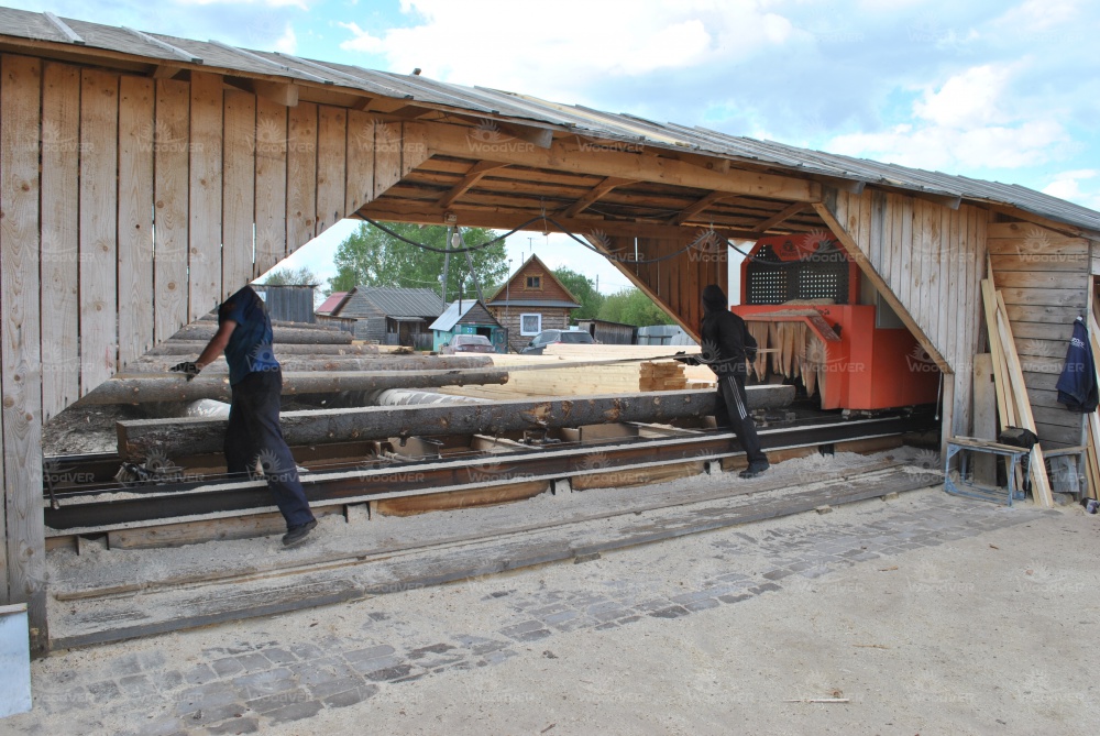 В целом же, можно отметить классическую компоновку рабочего пространства. Пилорама целиком под навесом. Слева брёвна, справа пиломатериал. Двое подсобных рабочих у станины, третий человек - оператор за пультом управления. Дополнительный транспортёр переваливает опилки направо от пилорамы.