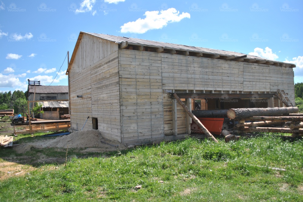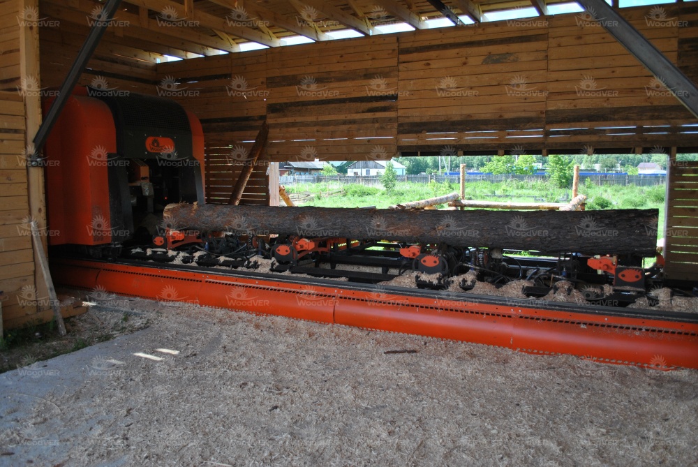 Станок размещён под навесом, через один проём выполняется подача сырья, через другой двое подсобных рабочих забирают пиломатериал. Опил автоматически выносится скребковым транспортёром к торцу станины.