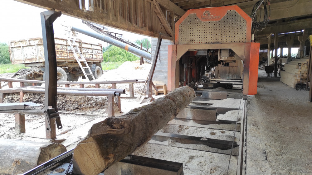 В зависимости от нужд предприятия в рабочем цикле задействована одна или сразу обе пилорамы. На момент посещения шла работа по производству тарной доски и сборки поддонов, с распиловкой короткого осинового сырья. Основной лесопильный процесс происходит с 6-метровыми брёвнами хвойных пород.