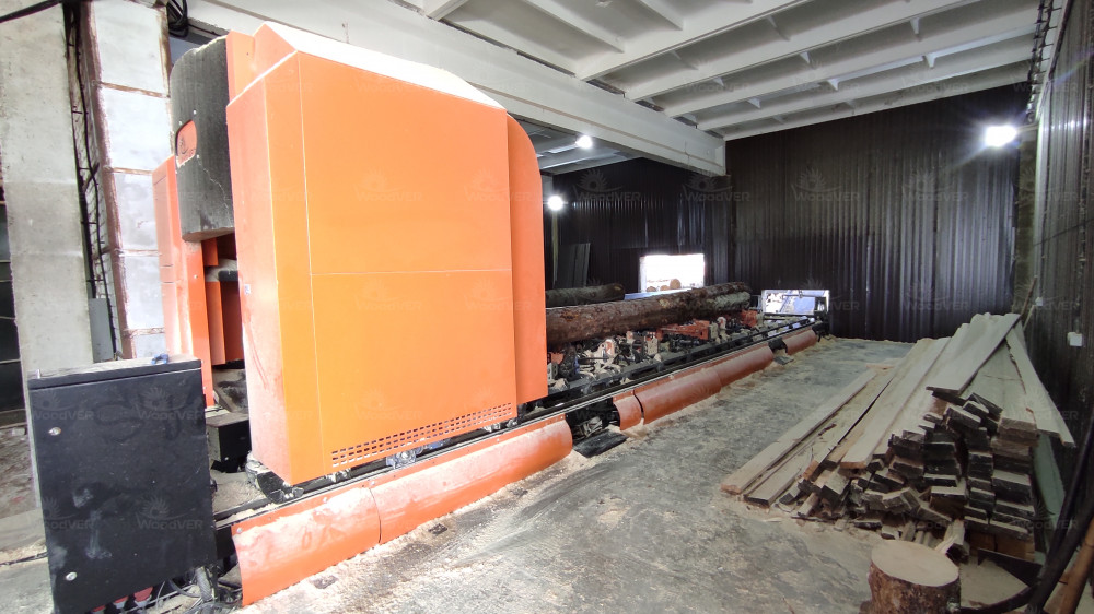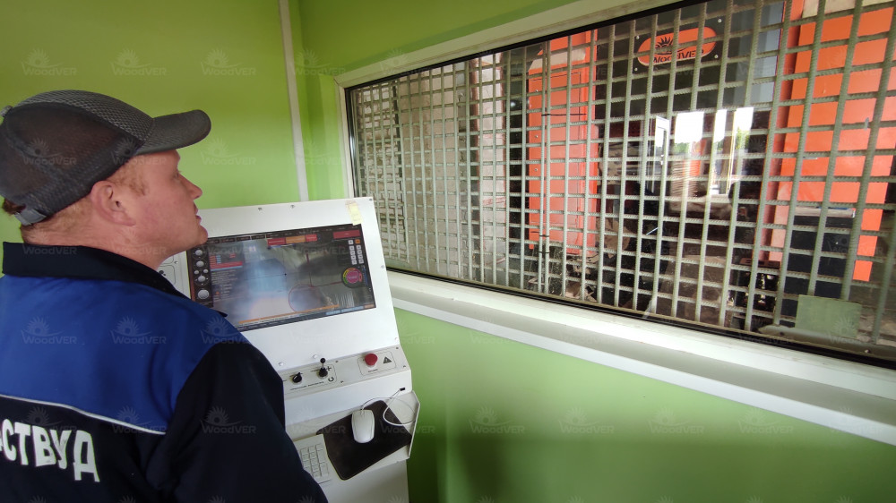 Угловой пильный комплекс УПК-1 к моменту посещения эксплуатируется несколько месяцев для работы с брёвнами крупных диаметров. Станок оснащён автоматизированной подачей сырья с улицы внутрь цеха. Параллельно транспортеру брёвен на улицу с помощью подъёмного модуля скребкового транспортёра выводится опил.
