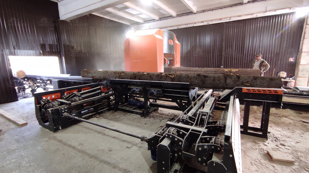 Для оператора выполнена с торца пилорамы отдельная кабинка, при необходимости оператор выходит для помощи подсобному рабочему. Пиломатериал в процессе пиления сразу относят из рабочей зоны для укладки по размерам.