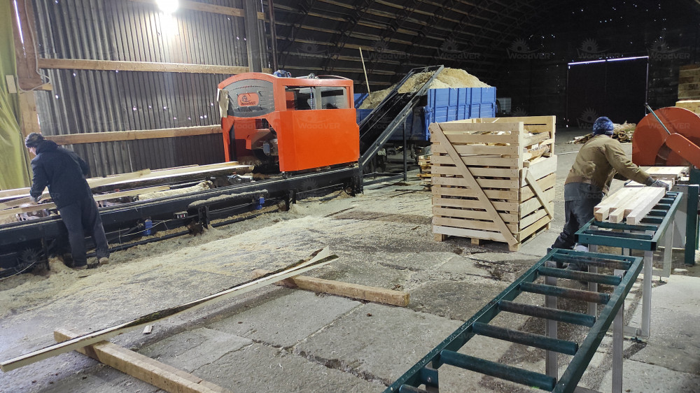Угловая двухдисковая пилорама ВудВЕР модели УГП2-600, представленная в данном сюжете, к моменту съемок в октябре 2024 находится в эксплуатации уже несколько лет.